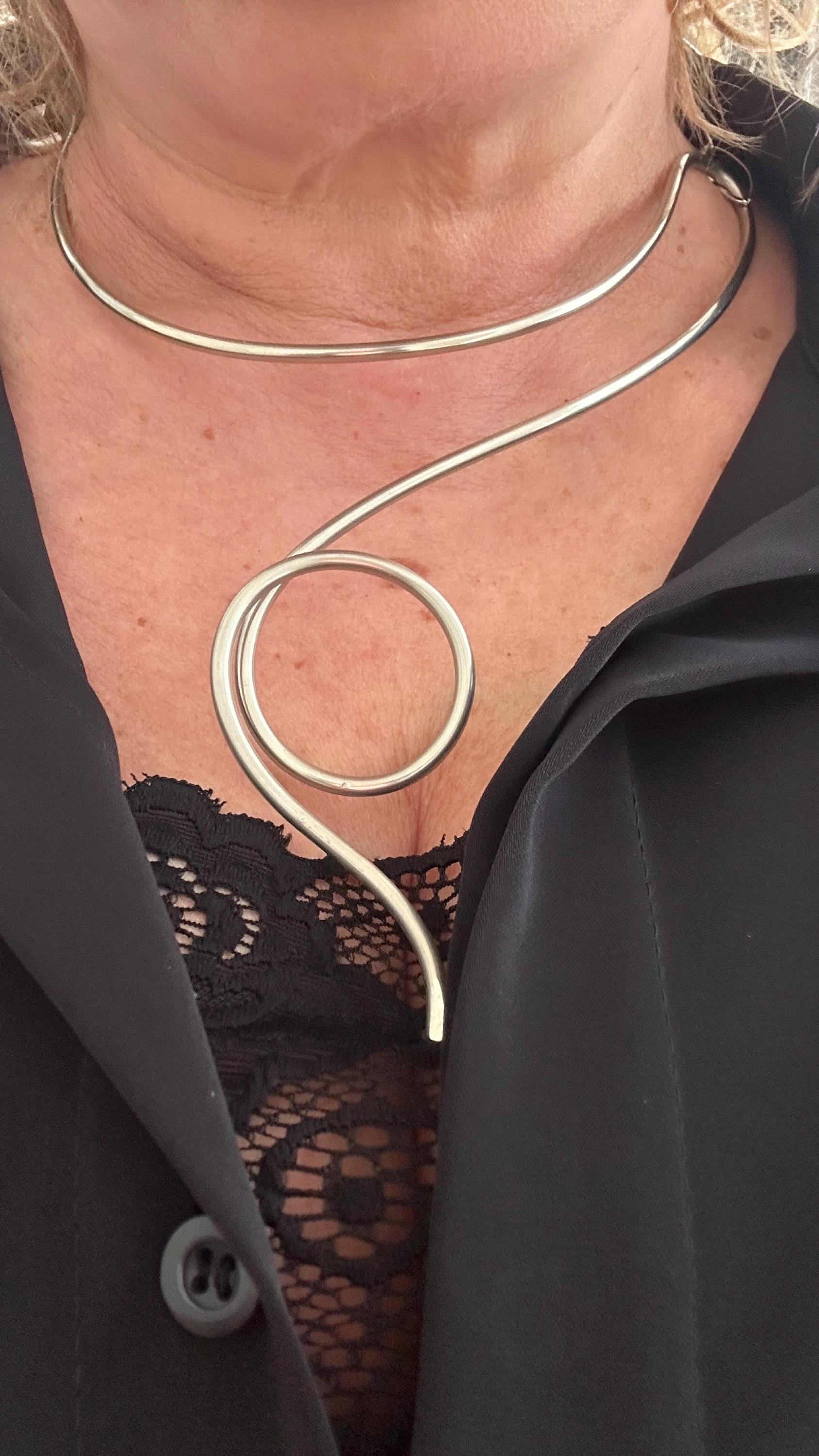 This necklace features a unique and original design, crafted from 3mm thick German silver wire, also known as Alpacca, and hand-crafted.